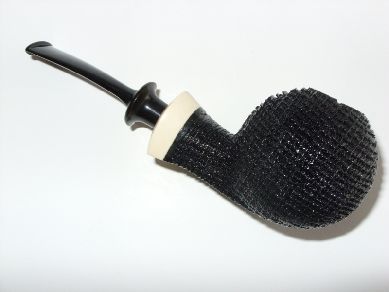 Gekauft habe ich diese Pfeife auf der Messe in Rheinbach im Spätsommer 2008. Eine Ball von Reiner aus dem Material Morta. Der Zierring ist aus Horn. Gestempelt ist sie "MS" |